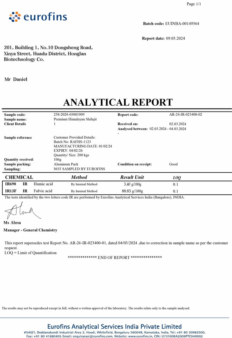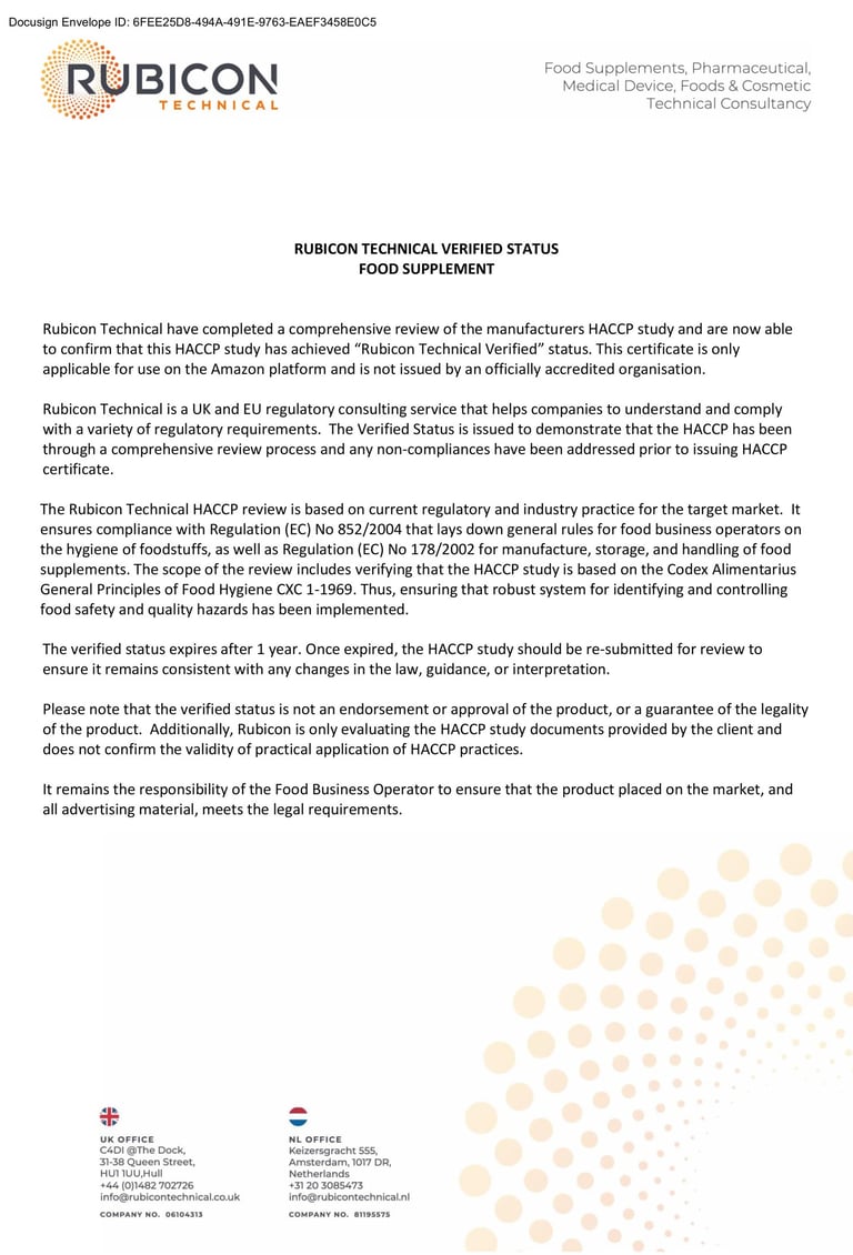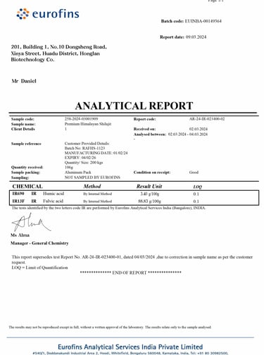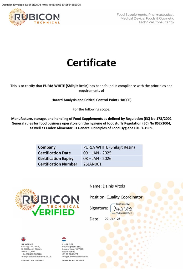 Our Certifications & Testing Standards We are committed to maintaining the highest standards of quality, safety, and transparency. Our Shilajit Resin is produced in certified manufacturing facilities and undergoes rigorous quality and safety testing to ensure it meets recognised industry and regulatory requirements. The certifications we offer reflect compliance with internationally accepted quality management and food safety standards, including manufacturing controls, hygiene practices, and product testing. Independent laboratory reports and certificates of analysis are available upon request to provide full transparency and customer confidence.